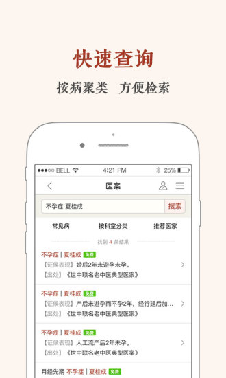 5、精准查询:支持按医家查询,按科室分类查询,并提供症状、脉象、舌相等精细搜索