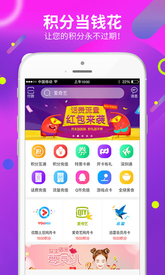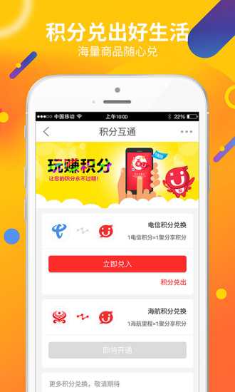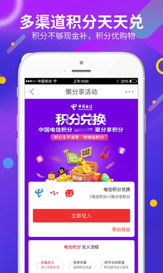中国电信战略合作伙伴--聚分享手机app,致力于打造国内领先的“移动互联网通用积分服务平台”,为广大用户提供积分账户的管理及使用功能,包括积分查询、积分兑换、以及积分支付等,打通各个渠道积分包括将话费积分、信用卡积分、酒店积分、航空积分、旅游积分、网上商城购物积分、线下消费积分等汇集到一起消费。现版本支持中国移动积分、中国电信积分兑换成聚分享积分。