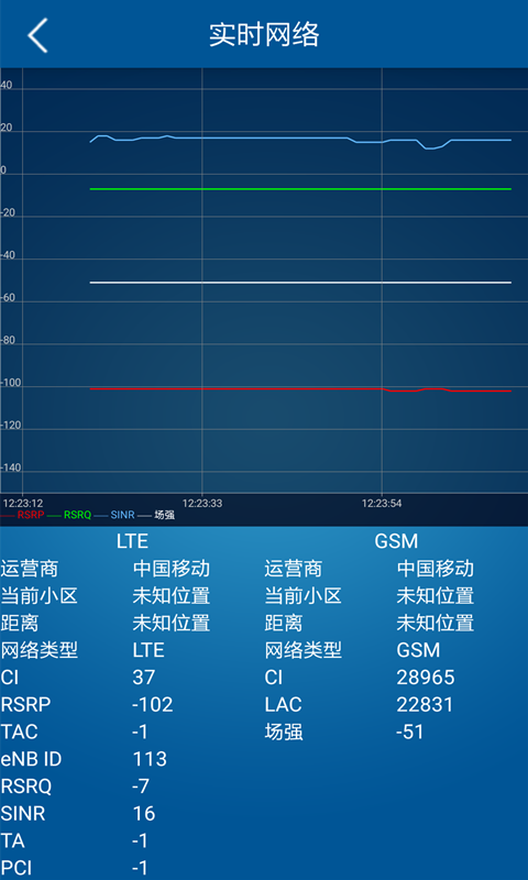 1、实时网络:支持三大运营商2/3G的场强和CI,4G下的rsrp、sinr、ci、enob_id、pci、ta等参数,支持工参导入后的小区匹配和距离显示;