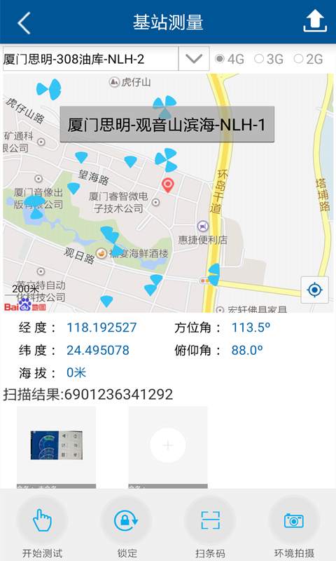 5、基站测量:网优/督导可通过手机传感器获取天馈的挂高、方位角、机械俯仰角经纬度等物理参数,并配有照相功能记录天馈周围的实际环境。在导入工参之后能自动匹配小区并在地图上显示与之相关的周围的站点分布情况;