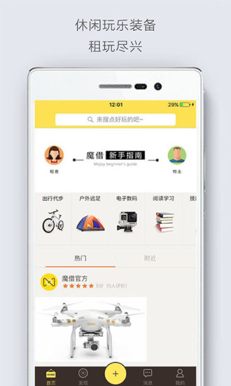 1、魔借是一个全新的商品租赁购物平台,新奇的高昂的东西越老越多,我们会越来越发现各类玩乐好物我们已经不再需要去购买,通过租赁共享我们就可以满足自己的需求,同时在物质过剩的时代中减轻我们的生活负担。用户可以在平台上租用到自己短期需要、想要体验的物品装备。