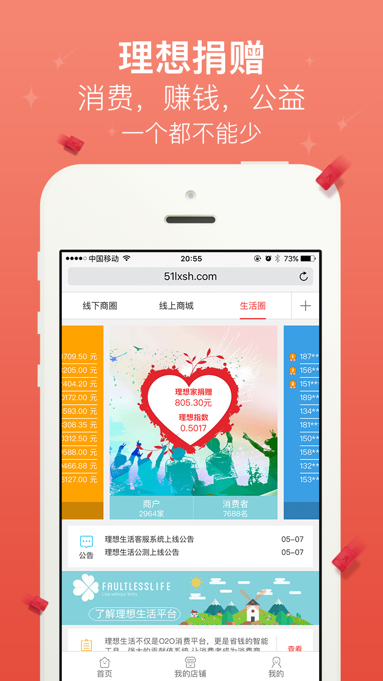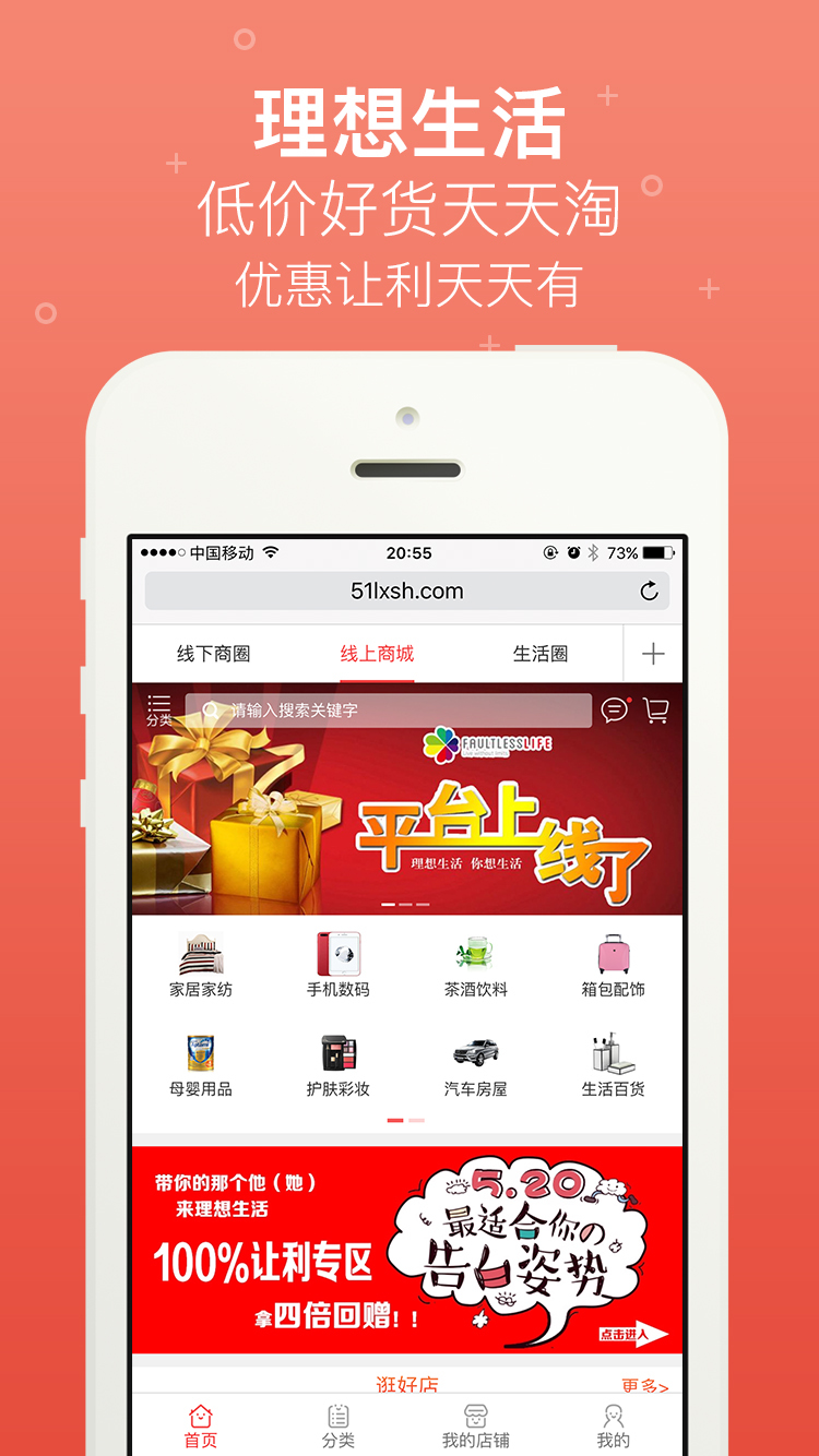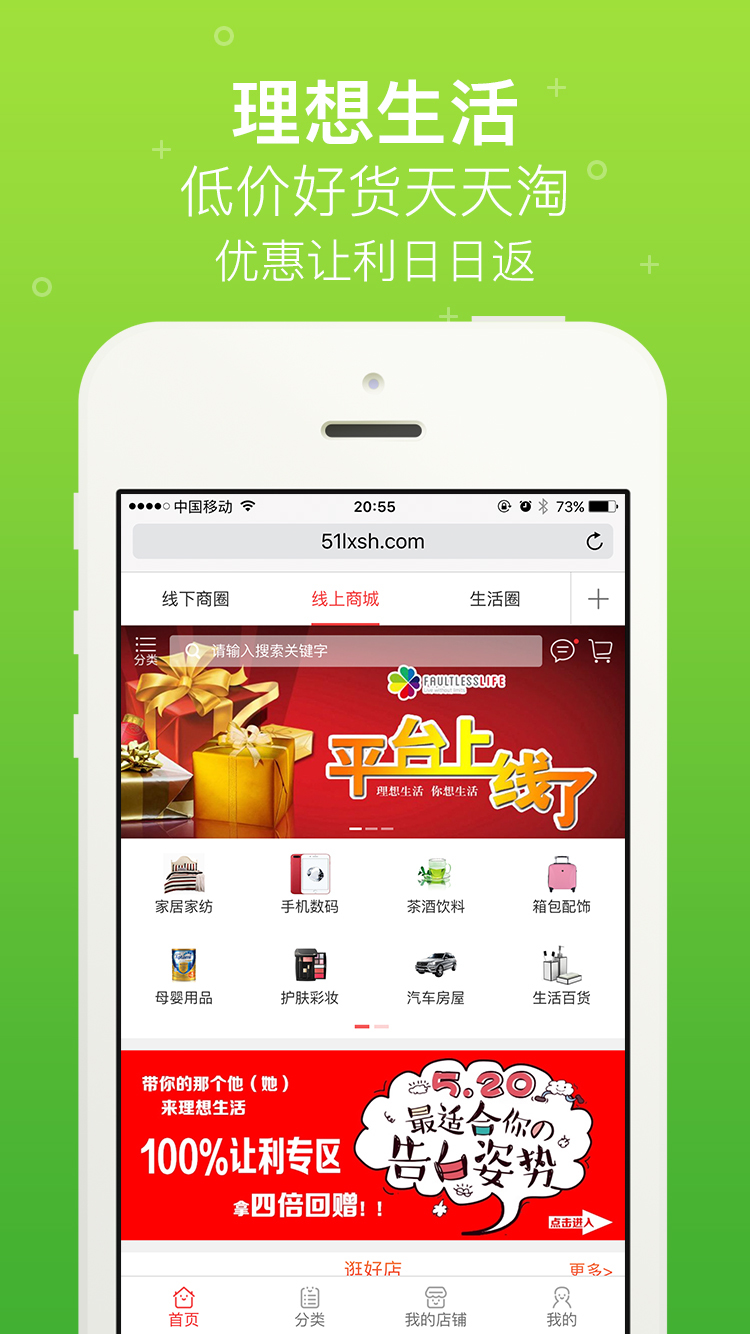 一个满足所有生活需求的O2O消费购物商城,让你体验与众不同的购物感觉!理想生活,让生活更理想。你所追求的理想生活,就是商城的服务宗旨。