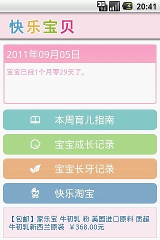育儿指南、亲子游戏、宝宝成长记录、快乐淘宝,尽在《快乐宝贝》。 《快乐宝贝》是一款为六周岁以下宝宝的爸爸妈妈精心定制的软件。本软件可以随着宝宝的成长,为您同步提供适合宝宝当前年龄段的育儿指南,让您了解宝宝每一周、每个月的生理心理特征及变化、育儿注意事项等。在宝宝的成长过程中,游戏有着非凡的意义。《快乐宝贝》每周为您精心挑选一个适当宝宝当前年龄的亲子游戏,让宝宝在游戏中快乐成长。《快乐宝贝》还会智能的提醒您测量并记录宝宝的身高、体重,让您在记录中享受宝宝成长的快乐,同时也为您和您的宝宝留下一份弥足珍贵的数据。“快乐淘宝”为您精选了宝宝当前年龄、当前季节最需要的各种宝贝,让您淘得开心、淘得快乐。