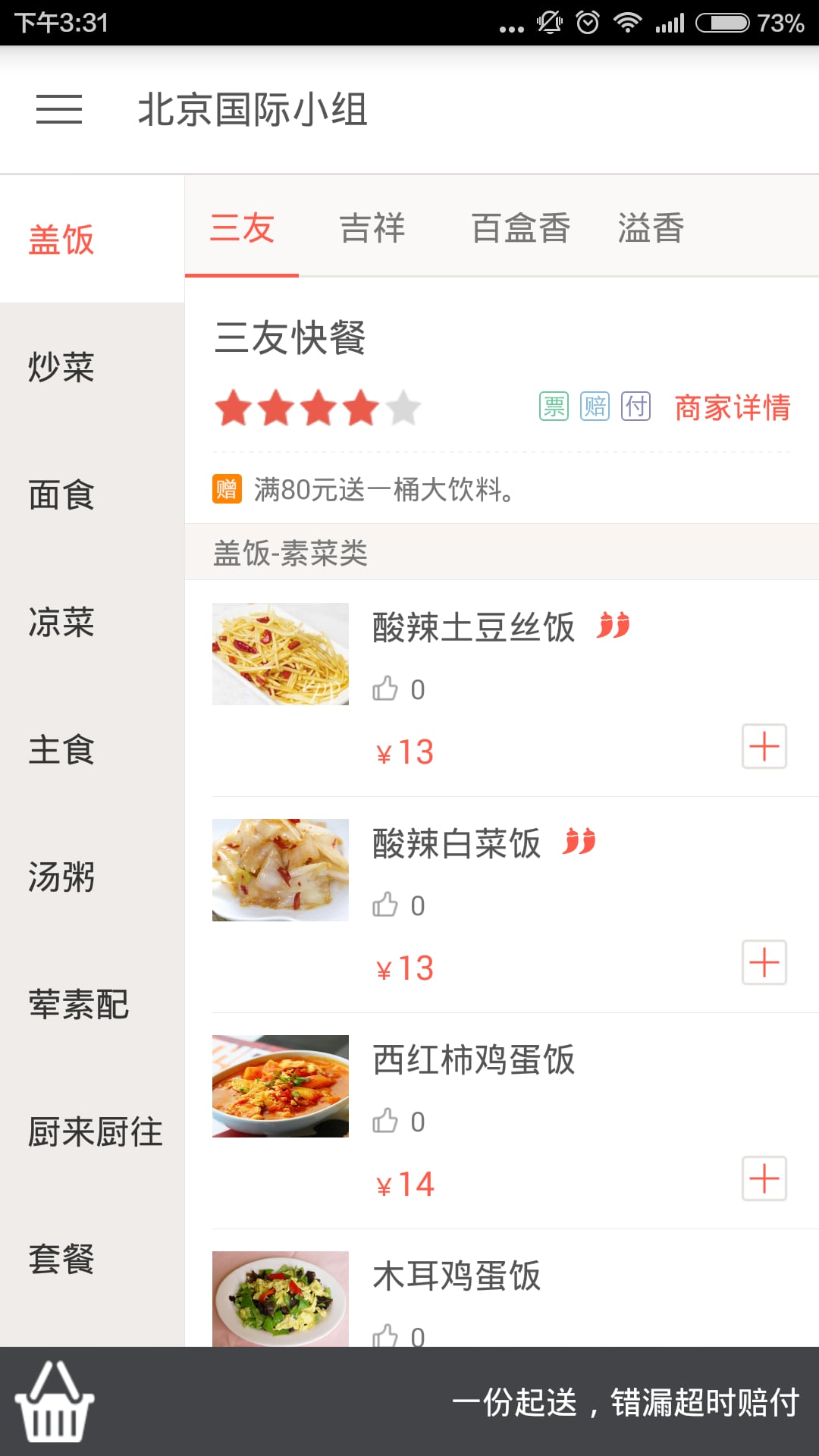 小组饭精选商家,优选油米调料,为您提供荤素配、盖饭等美食,管饱管健康! 【一份起送】,无起送价也无需拼单 【售后保证】,最良心快捷的错漏超时赔付 【快捷点餐】,肚子超饿,还要选商家,头疼!直接在首页点餐吧 在小组饭点餐,就是这么简单,还有各种优惠、饭票、积分兑换、限时抢、先吃周付等惊喜等着你哦~! 【小组饭,让工作餐更暖心】
