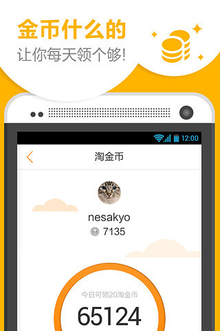 5、领金币和摇金币:每天领取淘金币,还可以摇一摇获得额外金币。新增淘金币抽奖功能;