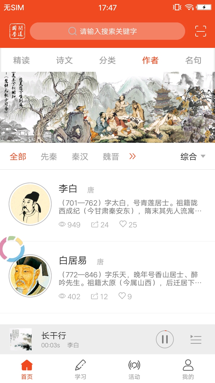 问道国学是一款很不错的学习工具,而且还是一款有声读物,对于喜欢诗词或者是学生的用户来说都是不错的选择,界面清爽无任何的广告,支持关键词的快速搜索,当然了你也可以进行分类查找,按照朝代、作者以及题材进行详细的分类,诗词的资源相当的多,随时就可以拿起来听,而且还有详细的译文以及注释,让你全方位的进行学习和鉴赏,也可以辅助背诵课文,天天没事就听,不担心背不下来。