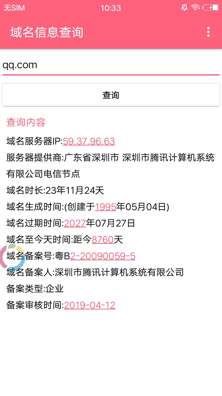 一款超方便的域名查询应用,界面无广告,功能简单操作方便,直接输入你想查询的域名即可,可以详细的显示域名的服务器IP,服务器的工业上、域名时长、域名生成时间,域名过期时间以及距今多长时间、域名的备案人等等,信息详细操作方便。