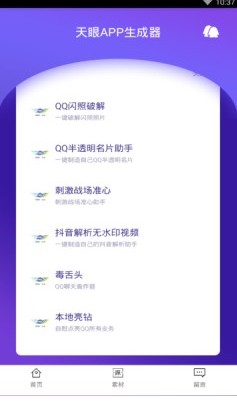 天眼APP一键生成是款简洁的小工具,支持扣字神器素材、聚合生成器素材以及直播磁力盒子素材和抖音无水印解析素材等几十个功能,操作方便,界面简洁清爽而且所有的功能都是免费在线使用的,无任何的操作难度,喜欢的可以试试。