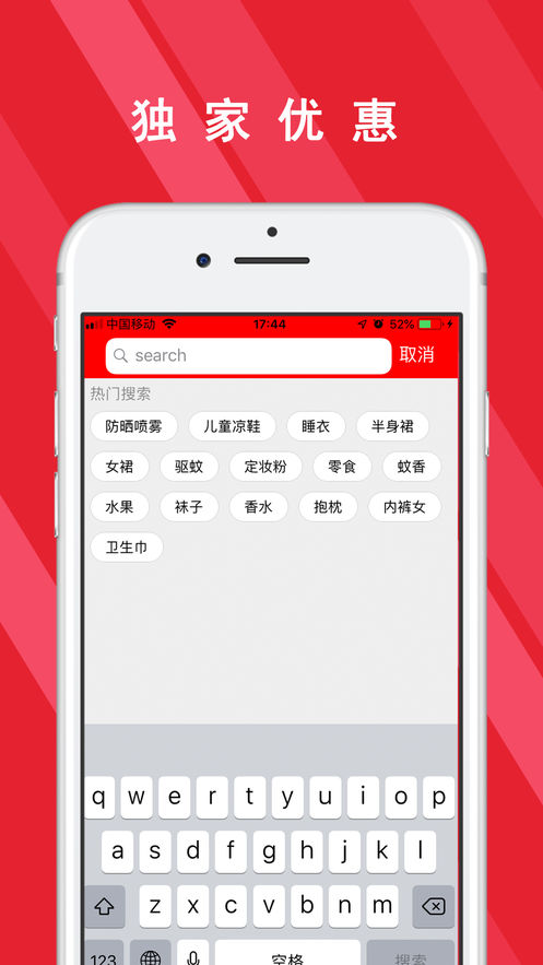 这是一个导购APP,实时筛选具有折扣的商品,显示商品信息和折扣力度以及折扣时间,用户可以搜索自己想要的商品,并且可以选择是否查看只有折扣的商品,没有折扣的商品用户也可以选择查看,并且可以按价格人气等筛选想查找的商品,并在APP,通过特有的优惠券链接,跳转至淘宝的粉丝福利购中,领券进行购买