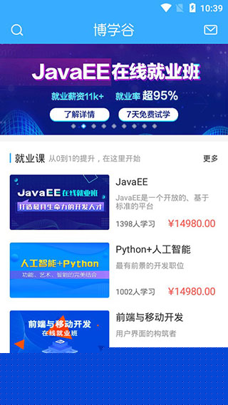 博学谷app是一款基于IT在线教学研发的移动学习工具,由江苏传智播客教育科技股份有限公司出品。它基于企业10年IT教育经验和大数据采集技术,可根据用户需求提供JavaEE、Python+人工智能、前端与移动开发、软件测试、云计算大数据、Go语言与区块链、UI/UE设计等在线就业班,且与同类型软件相比内容更具广度、有深度,由国内顶尖讲师365天全程授课,助您快速掌握核心技巧。同时,软件还特别推出IT学习圈,这里有从官网早毕业的同行前辈在线,也有业界技术大牛驻扎,无论你是想要了解什么类型的IT问题,都将第一时间为您解答,有需求的朋友请放心体验!