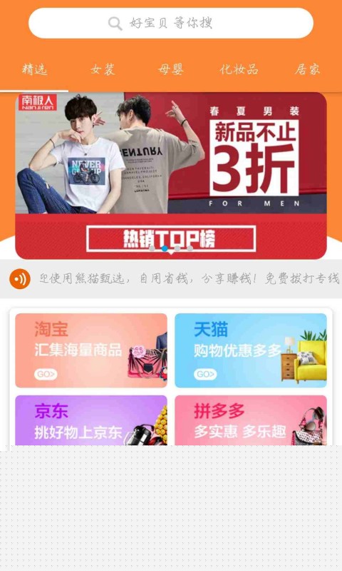 熊猫甄选app是一款专为喜欢网购的人提供的网络购物应用,在这购物可以让你轻松省钱哦。如果你不信那更要来这试一试,当前已经有不少的用户都成功省了钱,小编也省了200-500元之间,如果你也是一个热爱购物的人,你买的多省的就多。只需要简单的三步骤就可以轻松省钱,如果你想赚钱你只需要两步骤就可以赚钱,省钱又赚钱你还在等什么,快来体验吧。