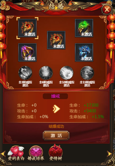 四个戒指分别需要达到【结婚状态】【通关10关】【通关20关】【通关30关】四个不同的等级才可以开启