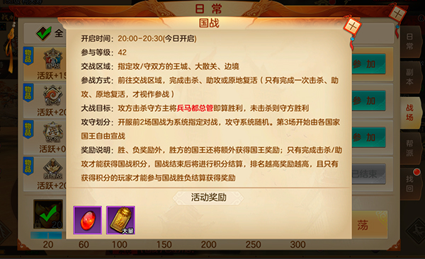 玩家达到42级可参与国战,国战活动于成功宣战后次日20:00-20:30开启,大战目标为攻方击杀守方主将“兵马都总管”即算胜利,未击杀则守方胜利,国战除了胜负奖励外,胜方的国王还额外获得时装奖励;