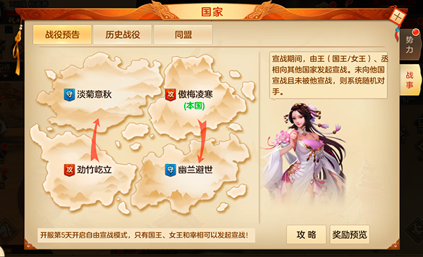 首先,国战只有国王和宰相才可以发起宣战,开服第5天开启自由宣战模式,宣战会消耗一万国家资金,国家资金不满足时,宣战失败,宣战失败后系统会随机匹配国战双方;宣战时间为1天,开战时间为第2天的20:00-20:30,宣战后要注意查看活动时间,千万不要错过为本国家建功立业的机会哦!
