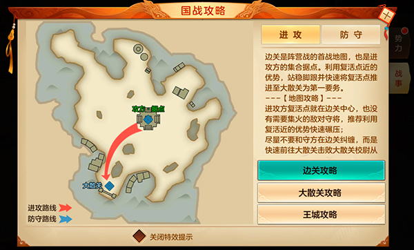 1、真正成为战场的交战区域是在大散关,大散关中部会出现一位“东郊BOSS”,攻方击杀边关守将后,在边关守将处可激活复活点,激活复活点后,攻方玩家将直接复活到大散关,大大加强了攻方玩家的支援进度;