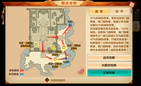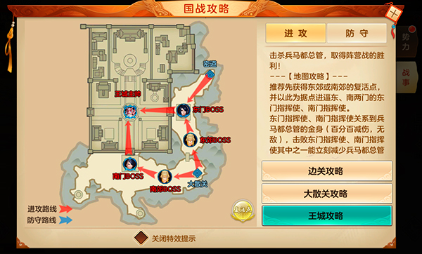 3、复活点抢夺战之后,就是决定胜败的关键了,攻方需要击杀东门BOSS或南门BOSS,获得东门BOSS或南门BOSS的归属权之一,才能对兵马都总管造成伤害,东门BOSS和南门BOSS归属守方时,分别能为兵马都总管加持40%的减伤效果,如果同时击败东门BOSS和南门BOSS,都总管的减伤将降为0,所以,攻方玩家最好能同时拿下东门BOSS和南门BOSS的归属权,再攻击都总管才是上策;而守方的侧重点也将是东门BOSS和南门BOSS,只有拿到东门BOSS和南门BOSS的归属权,才能更好的守护兵马都总管;国战将在兵马都总管被攻方击破时结束,或守方在规定时间内兵马都总管未被击破。