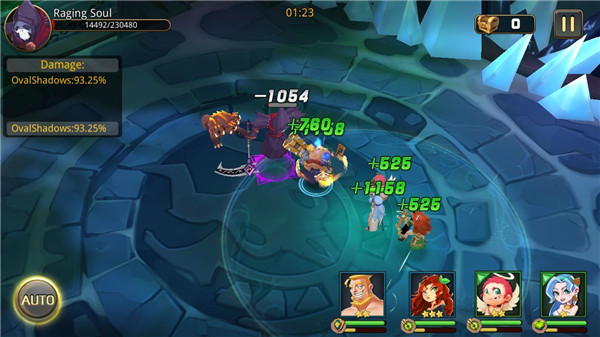 3、PVE战斗:整体操作,四英雄阵容,简单易上手;节奏主导游戏进程,以英雄走位和集火调节节奏,体现操作乐趣;