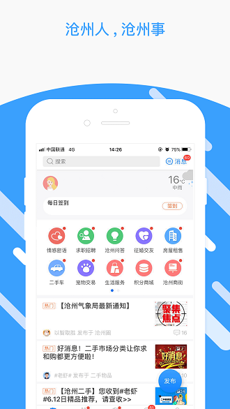 地方城市信息服务手机软件,用户可以来这里了解沧州的海量资讯,包括老百姓最关系的吃喝玩乐,通用一键定位更加容易找到用户最关注的信息,还有本地论坛等你来交友。