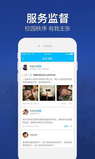 3、服务监督:师生可提交文字、图片对校园情况进行反馈、监督;