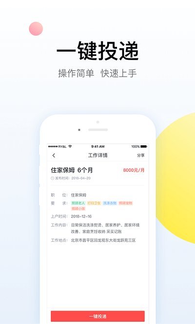 阿姨一点通是58到家为广大家政从业工作者量身定做的集学习、生活、工作为一体的家政app。我们拥有大量真实优质就业机会,阿姨们可以看到雇主发布的需求从而实现抢单找到合适工作,同时我们拥有标准化的系统培训,高准度的工作匹配,完善的商户保障体制,完美解除阿姨们的后顾之忧。
