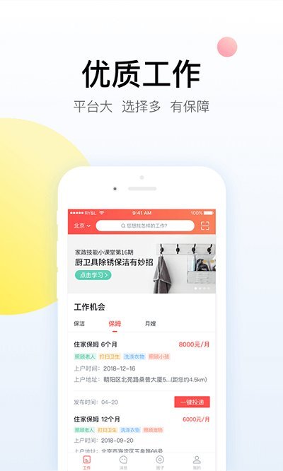 生活家政服务手机软件,用户可以来这里请保姆,我们提供各种保姆,都是经过使命认证,有保障经过专业的培训的团队,让你大胆放心使用,用户也能来这里找到当保姆工作,我们有专业的学习视频等让你轻松上岗。