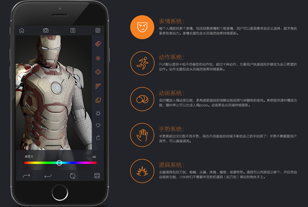 Pofi无限人偶Pro专业版-拥有表情系统、动作动画系统、手势系统、VR系统、材质灯光等等多达五十种以上的高级功能,并可免费使用超过三十款的人偶与不同道具主题,另外包括云端动作保存和资源更新。