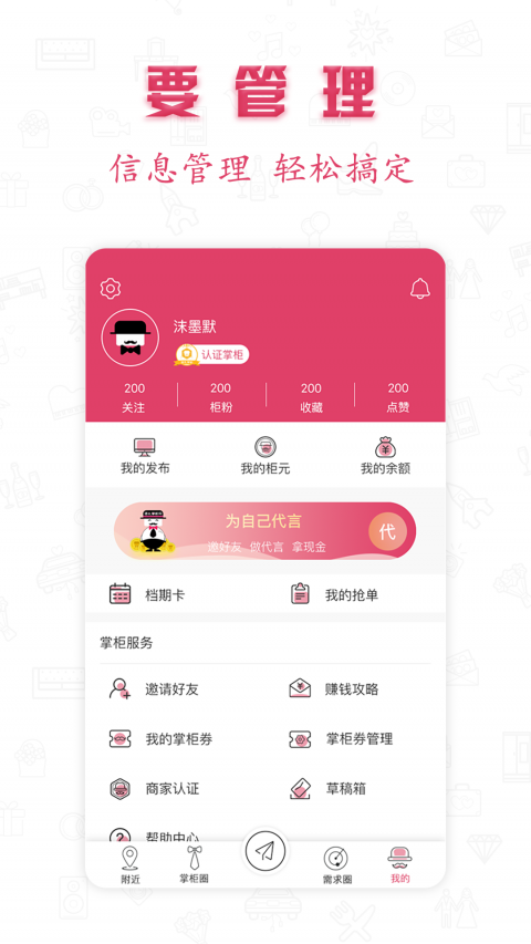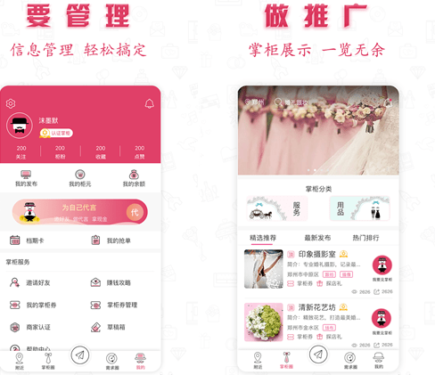 婚礼掌柜,为婚庆商家打造的必备神器,提高商家曝光率,线上合作推广之必备神器。婚礼掌柜全国已经有上万商家入驻,已覆盖至全国地市,婚礼掌柜是婚庆行业中的分类信息App,其中,服务类:司仪、摄像、跟拍、跟妆、督导、策划、酒店、花艺、布场、礼炮、演艺、培训、婚纱摄影、婚车服务;用品类:婚纱礼物、珠宝首饰、喜庆用品、婚庆家纺、家居家电、酒水饮料、蛋糕甜点、婚房精选、爱车精选、婚礼道具24种分类满足婚庆各方面的需求,婚礼掌柜,商家必备。