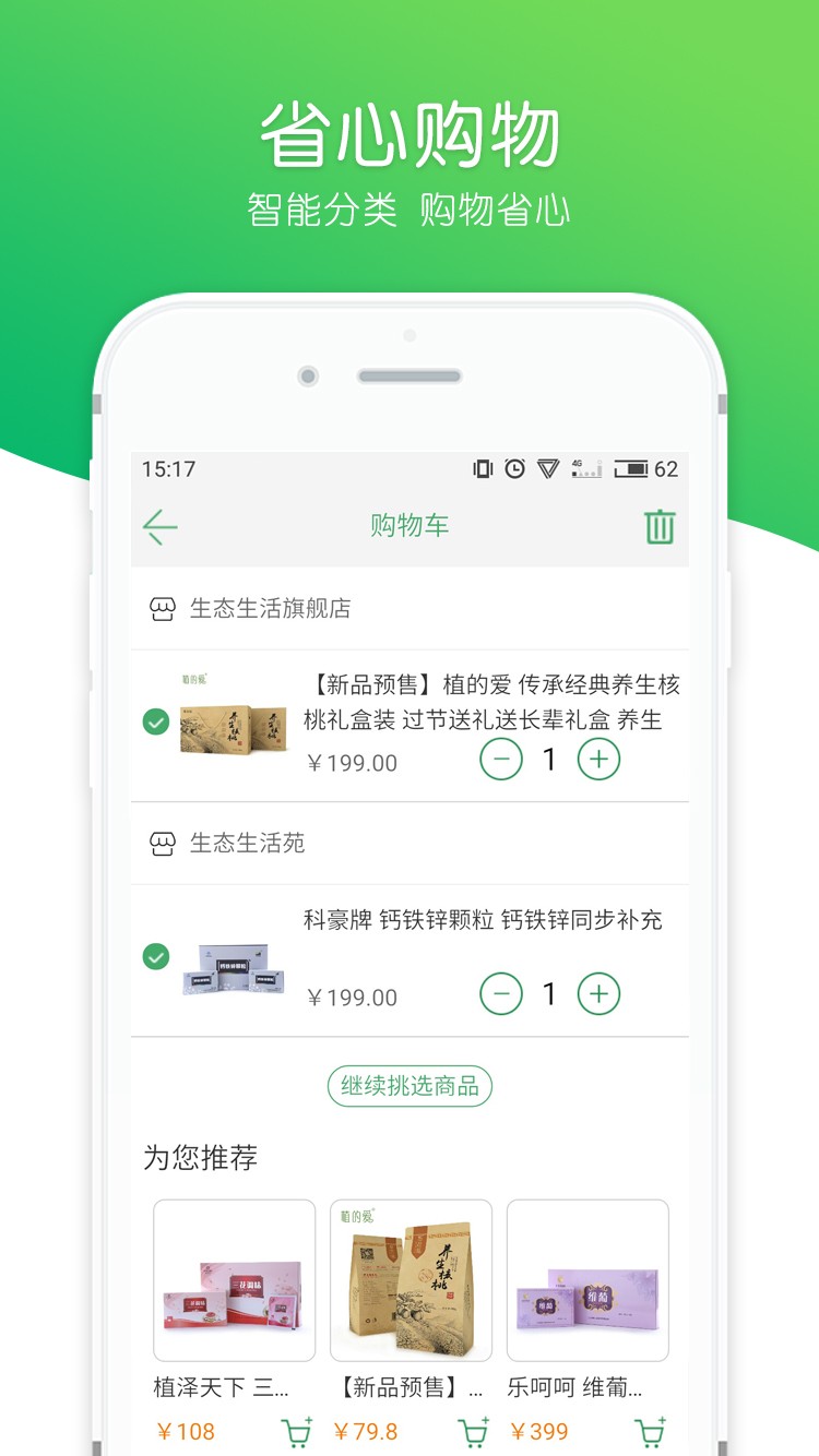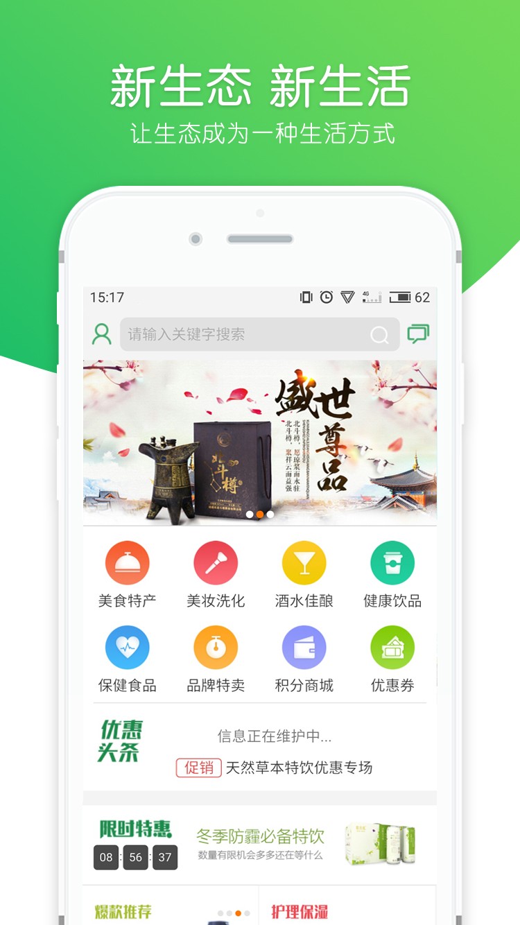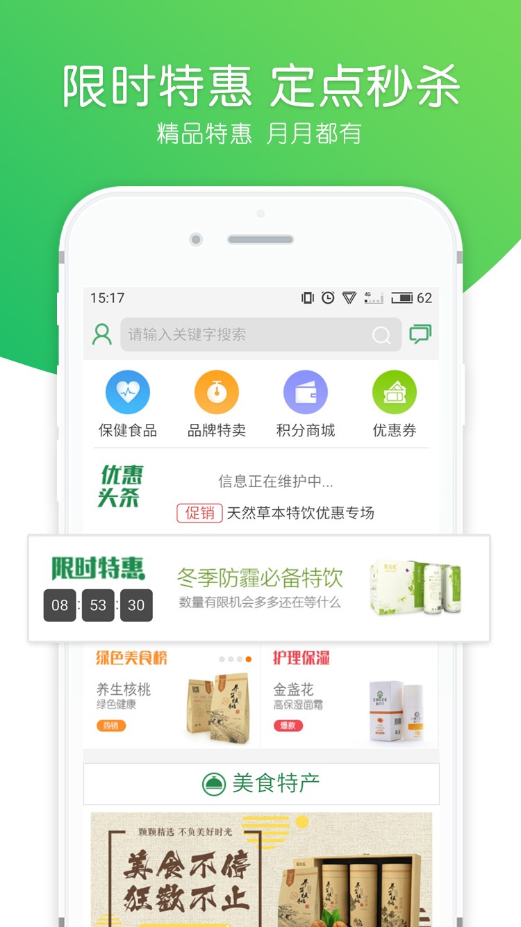 执着于为用户提供新鲜的绿色生态产品,为此,软件不断更新,为用户实时提供海量绿色的产品,每月还有秒杀特惠等,让用户能够随心购绿色生态食品。