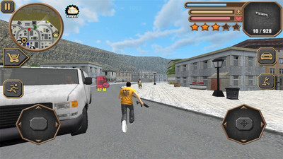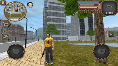4、自由的玩法,没有很明确的任务,不过一旦你偷了汽车就会有人攻击你,你可以收集金币去枪械商店购买武器,一场疯狂的冒险开始了。