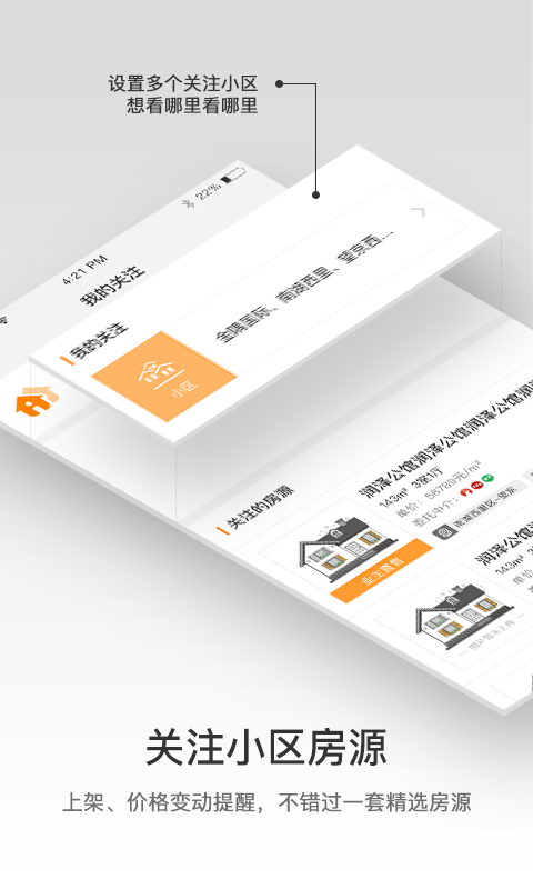 2、【关注小区】设置关注多个小区,房源上架、价格变动一目了然,更有消息推送、短信推送,不错过一次机会;