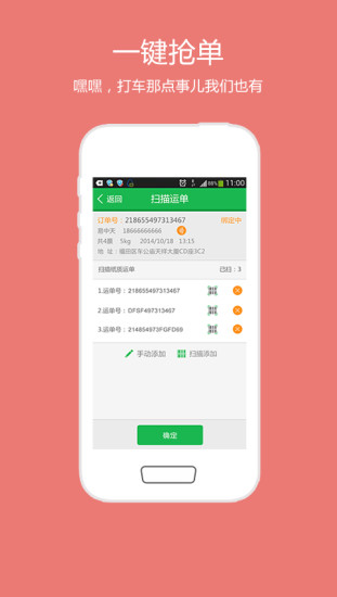 1、抢单:快递员随时随地在线接收附近订单,及时、精准地为客户提供递送服务,派件、接单两不误;