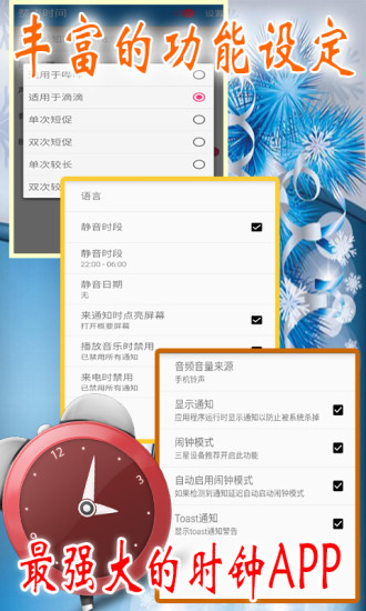 一款多功能时钟APP,可以合适安排你的生活习惯进行时间的设定提醒,定时提醒你的设定事。支持全天时间段提醒。从此你再也不会错过:正点抢购、英超赛事、喜欢的电视节目、还有商家的正点红包。手机都会以振动和别致音效,提醒用户,你的生活时间管理好帮手。马上一起体验吧!