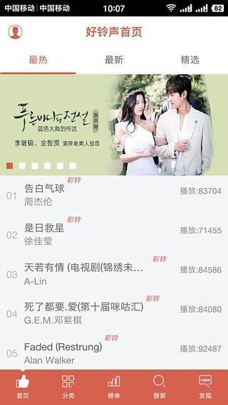 流行金曲,影视热曲,动漫游戏,短信闹铃,DJ舞曲,搞笑另类,网络神曲等;曲库超全,只要你想得到,在好铃声就能找得到;