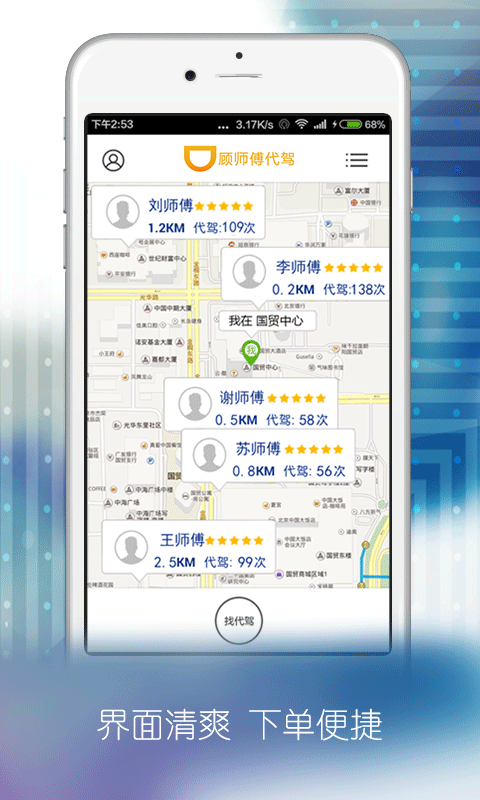 《顾师傅代驾》是一款专业的代驾服务平台,是中国代驾行业快捷、安全、值得信赖的专业酒后代驾、商务代驾、长途代驾服务商。喝了酒或是有其他事不能自己驾车,那快来试试代驾呗!