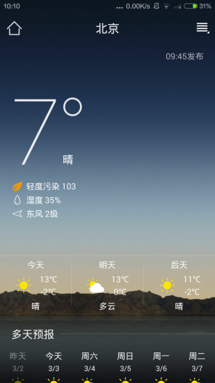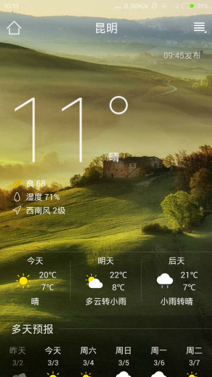 《掌上天气预报》是一款功能全面的天气查询app,这里提供全国各大城市及县区市天气信息,空气质量指数、污染指数、温度趋势等更加丰富、准确的天气信息!提供穿衣、洗车、紫外线、感冒、运动、旅游等生活指数,是您日常生活必备的软件!