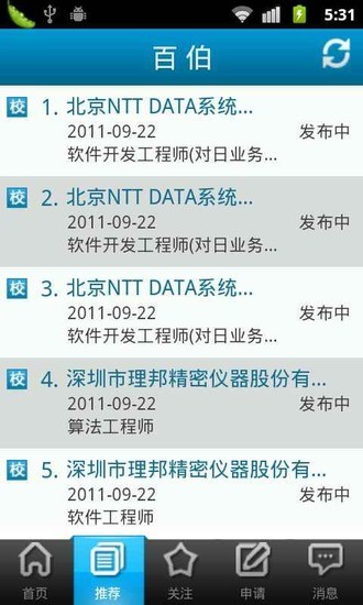 百伯招聘android版手机客户端,是由百度旗下招聘网站百伯网(www.baijob.com)精心为校园打造的求职招聘软件,软件包括资讯、推荐、关注、申请、消息等五大功能板块资讯功能提供各企业发布的最新招聘信息和宣讲会等信息,用户点击查看地图通过LBS定位导航地图,就能查看到宣讲会地址推荐功能根据用户的求职意向、投递行为和搜索行为自动匹配推荐职位,是广大校园求职者不可或缺的工具