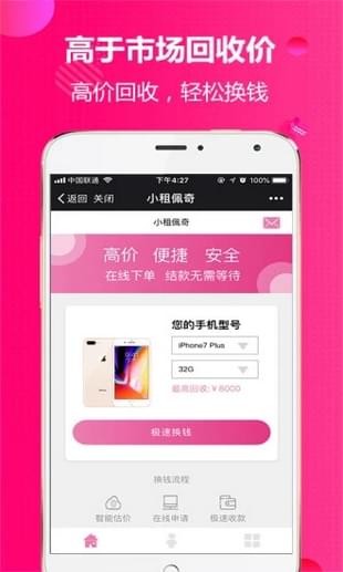 小租佩奇有专业的估价,申请通过率高达97%,二手手机高价回收,轻松换钱。手机在线操作,秒速下款,无需等贷,智能评估:申请门槛低,只要一部手机就能申请;