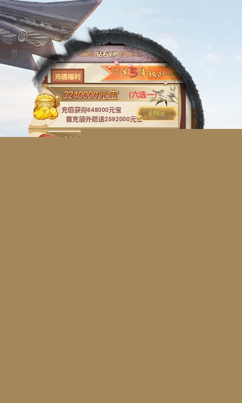 【上线福利】上线即送v12、88888元宝、1000万银两、1000万兵力、1000万粮草。