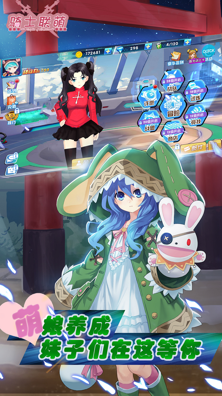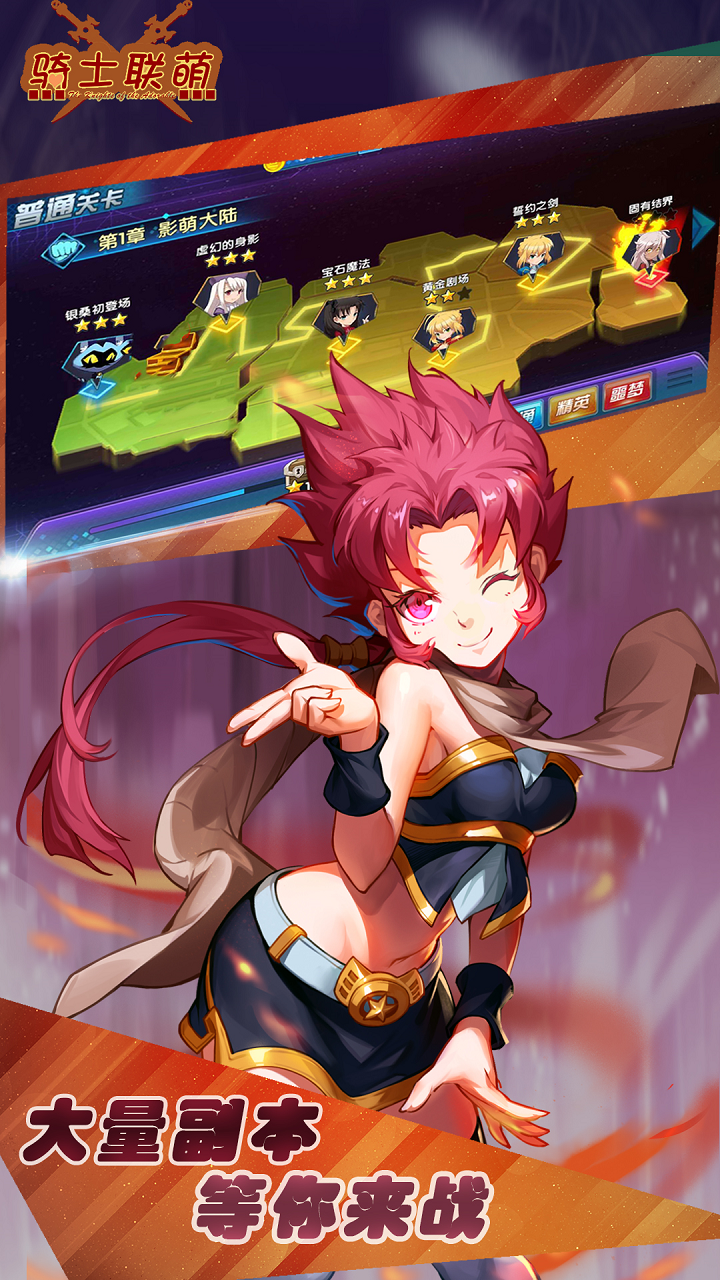 《骑士联萌》以二次元与现实世界同化的未来国度为背景,集结二次元动漫经典人物,不管是蜀黍,还是正太,到这里统统化身元气萌娘、女体英雄,再辅以技能点Max的呆萌舰娘,百搭乱斗,碾压对手,召唤萌娘军团,开启猎奇次世代;