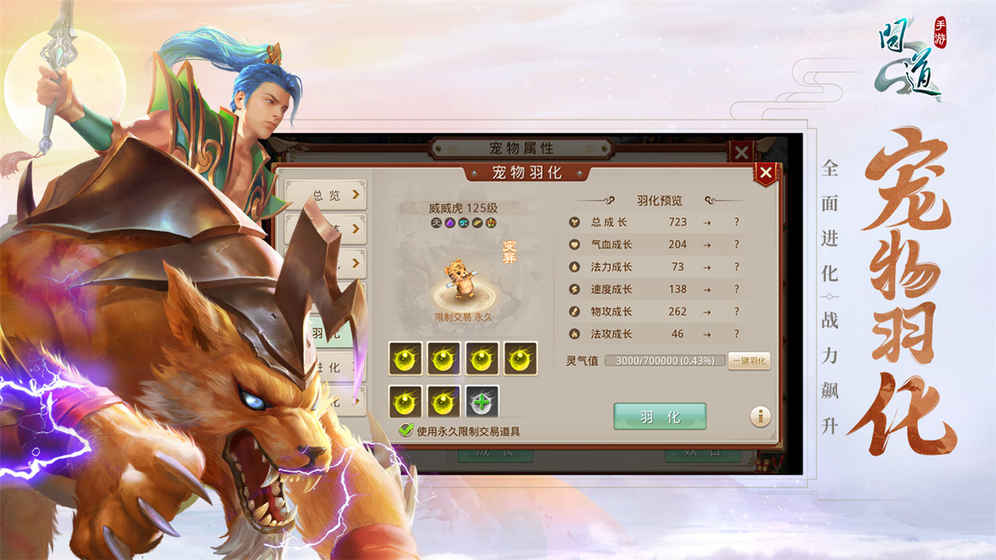 玩家不是单人作战,萌宠神兽相伴修行,战斗升级更快速。