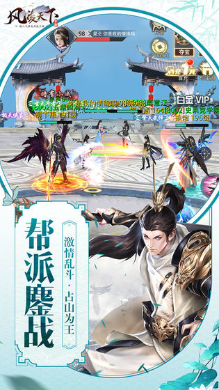 2、跨服征战,剑指八荒,仙盟吃鸡,百人决战夺神装。