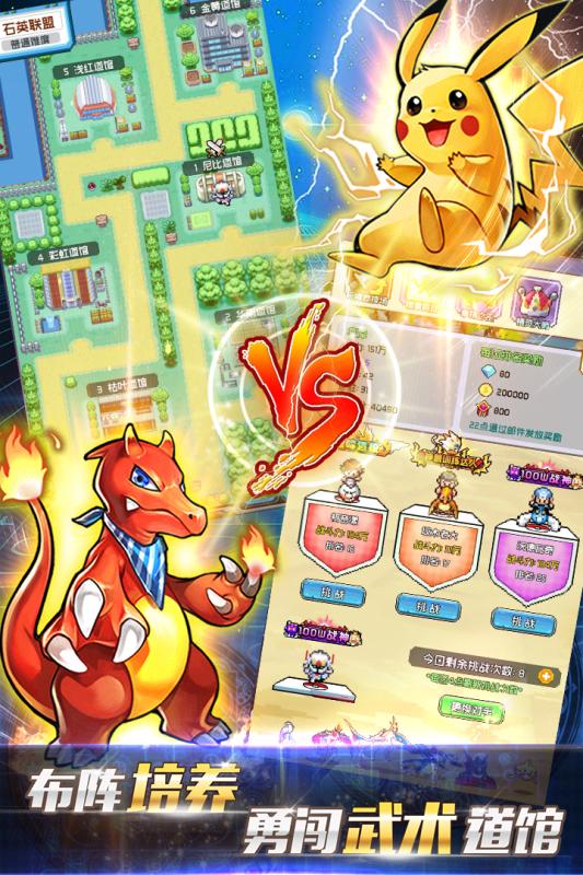 4、特色挑战道馆玩法。回归酷爽掌机体验。挑战特色道馆系统,赢取超值奖励,成为道馆一馆之主,开辟多特属性之路,等待其他晚上上门踢馆!!
