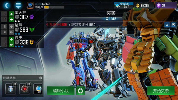 2、游戏中登场了大量的变形金刚角色,汽车人阵营的擎天柱、大黄蜂、热破和霸天虎阵营的威震天、红蜘蛛、惊破天等角色。