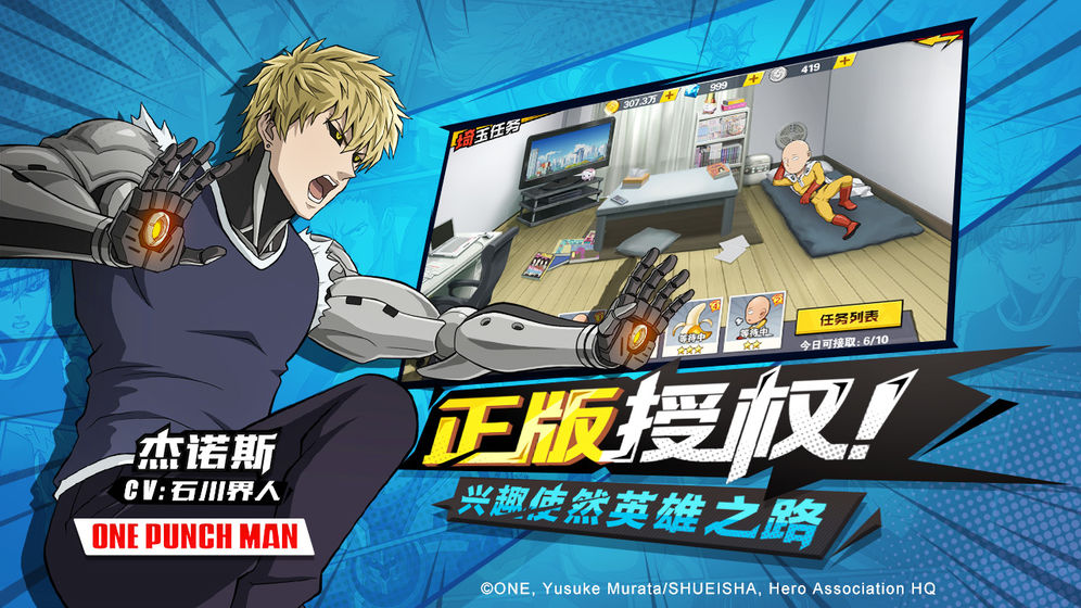 改编自一拳超人动漫,是首款官方授权游戏。游戏全程监修,正统还原动画设定,超人气角色收集,再现原作极致特效,激燃战斗。沉浸感的轻RPG玩法,玩家自由探索、冒险;创新半即时策略战斗,全屏必杀;埼玉登场,一拳秒杀!灾难降临,世界危机!率领你的队伍,直面这前所未有的挑战吧!