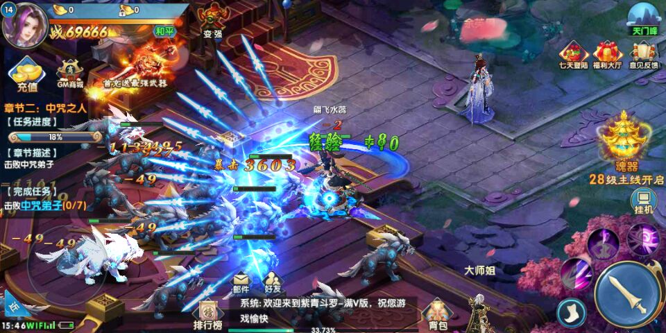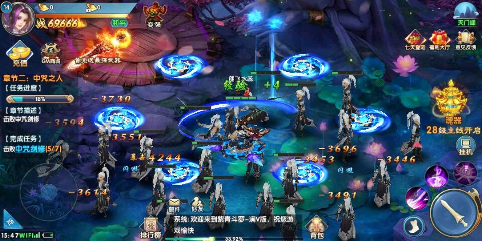 《紫青斗罗》中独创剑池系统,能够给玩家提示每天可完成的日常任务、帮派任务、各类副本,逐一完成后不仅能够升级角色、进阶战骑等,还能提高剑池等级,提升属性。