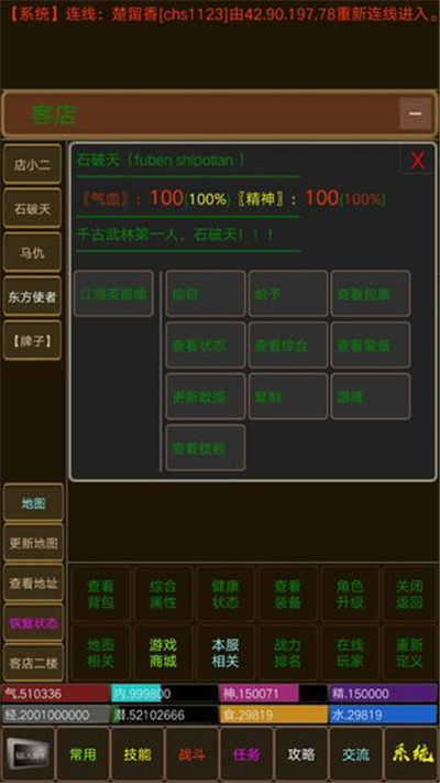 3、游戏江湖世界都是文字呈现出来的,但是也给玩家一个极大的世界脉络,玩家可以尽情畅玩。