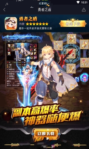 《勇者之盾》是一款即时战斗生存冒险的RPG手游戏。在这款游戏中,三大职业、六种角色任你选。用心打造并且深度还原经典角色和特色画面,华丽的即时战斗,选课的特效连招以及热血的背景音乐,超炫的时装自由装扮,给玩家沉浸式的游戏体验!感兴趣的小伙伴赶快来下载吧!开启你的冒险之路!