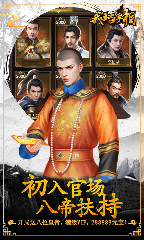 登陆即送:满级VIP,288888元宝,八位皇帝门客;