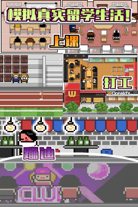 五魁首我的留学生活是一款像素风格的模拟生活类游戏。在五魁首我的留学生活中,玩家将扮演一个刚开始留学生活的大学生,除此来到异国他乡,一切都要靠自己。留学的生活到底会发生些什么呢?你可以选择打工赚零花钱,可以宅在宿舍打游戏,当然也可以和同学一起去夜店蹦迪,但是小心妈妈打来的电话哦。
