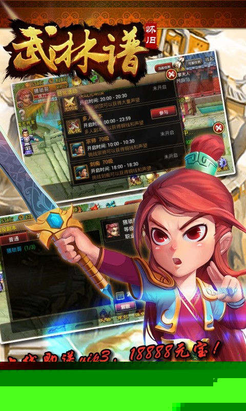 武林谱手游是一款布阵回合自动战斗的手机角色扮演游戏,取材于著名的武侠小说,用游戏塑造了一个亦真亦幻的武侠世界。游戏集合了伙伴养成、装备强化、帮派对抗、竞技场等经典玩法,并且开创了一些全新的玩法,果园种植,护镖劫镖,武魂猎取……丰富深入的角色培养体系以及精彩丰富的线上活动,给你非凡的游戏乐趣 !